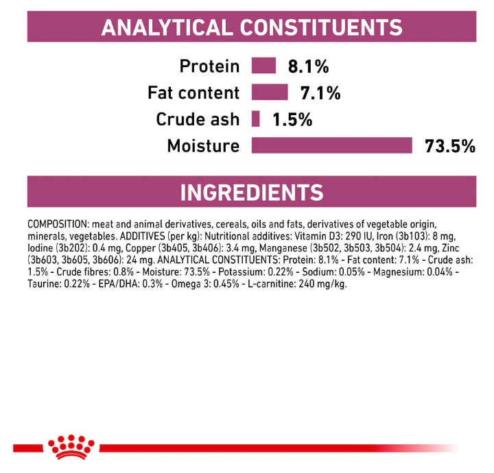 Analytical constituants: Protein: 8.1%, Fat content: 7.1%, Crude ash: 1.5%, Crude fibres: 0.8%, Moisture: 73.5%, Potassium: 0.22%, Sodium: 0.05%, Magnesium: 0.04%, taurine: 0.22%, EPA/DHA: 0.3%, Omega 3: 0.45%, L-carnitine: 240 mg/kg.
