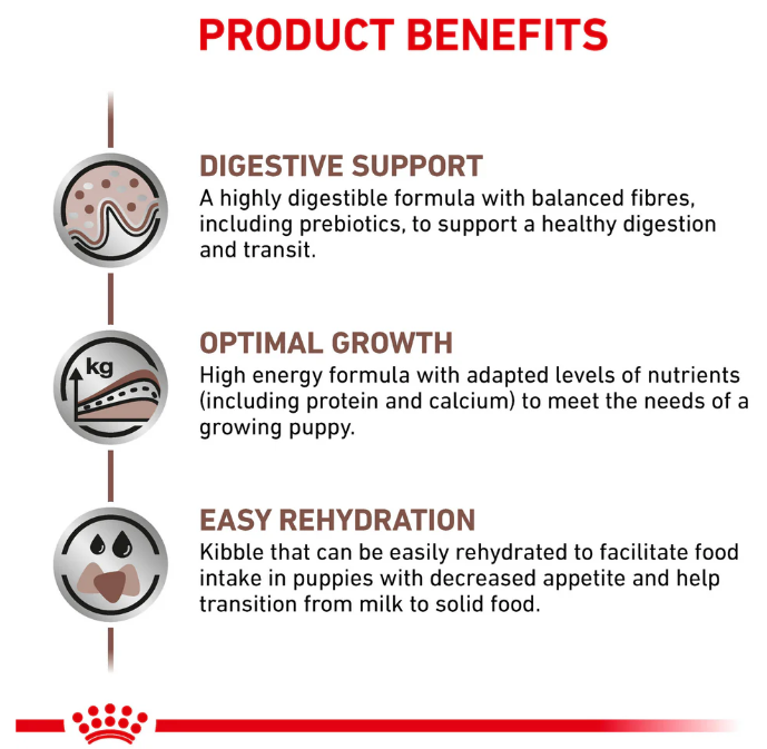 ROYAL CANIN® Gastrointestinal Puppy is specially formulated to support the nutritional needs of puppies with digestive sensitivities. To support healthy digestion and good transit, ROYAL CANIN® Gastrointestinal Puppy contains a specific blend of fibres, including prebiotics. Prebiotics contribute to a healthy balance of good bacteria in your puppy’s gastrointestinal tract. This product boasts a high energy formula with adapted levels of nutrients to meet the dietary needs of your growing puppy. These nutrients include highly beneficial protein and calcium.
