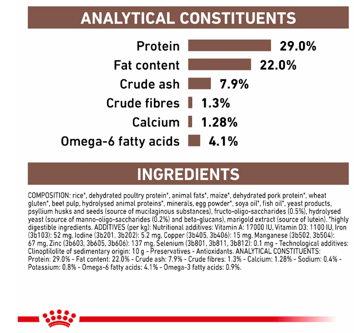 Brewers rice, chicken by-product meal, chicken fat, natural flavors, dried plain beet pulp, wheat gluten, egg product, corn protein meal, monocalcium phosphate, vegetable oil, pea fiber, fish oil, sodium aluminosilicate, potassium chloride, salt, taurine, powdered psyllium seed husk, calcium carbonate, fructooligosaccharides, hydrolyzed yeast, marine microalgae oil, vitamins[L-ascorbyl-2-polyphosphate (source of vitamin C), DL-alpha tocopherol acetate (source of vitamin E), biotin, D-calcium pantothenate, vitamin A acetate, riboflavin supplement, niacin supplement, vitamin B12 supplement, pyridoxine hydrochloride (vitamin B6), thiamine mononitrate (vitamin B1), vitamin D3 supplement, folic acid], DL-methionine, L-threonine, choline chloride, trace minerals[zinc proteinate, zinc oxide, manganese proteinate, ferrous sulfate, manganous oxide, copper sulfate, sodium selenite, calcium iodate, copper proteinate], marigold extract (Tagetes erecta L.), carotene, rosemary extract, preserved with mixed tocopherols and citric acid.