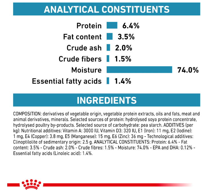 ANALYTICAL CONSTITUANTS: Protein: 6.4% - Fat content: 3.5% - Crude ash: 2.0% - Crude fibres: 1.5% - Moisture: 74.0% - EPA and DHA: 0.12% - Essential fatty acid (Linoleic acid): 1.4%.